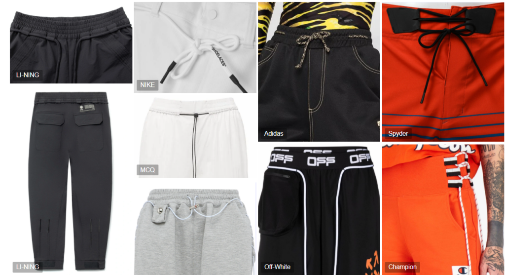 パンツの紐部分ををウエストバンドから露出または固定して、新しさをもたらします。